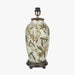 This hand-blown glass lamp is internally decorated with skilfully cut out images of leaves and quirky parrots which climb up this tall urn shape lamp. The background is distressed gold backed by soft, off white paint.