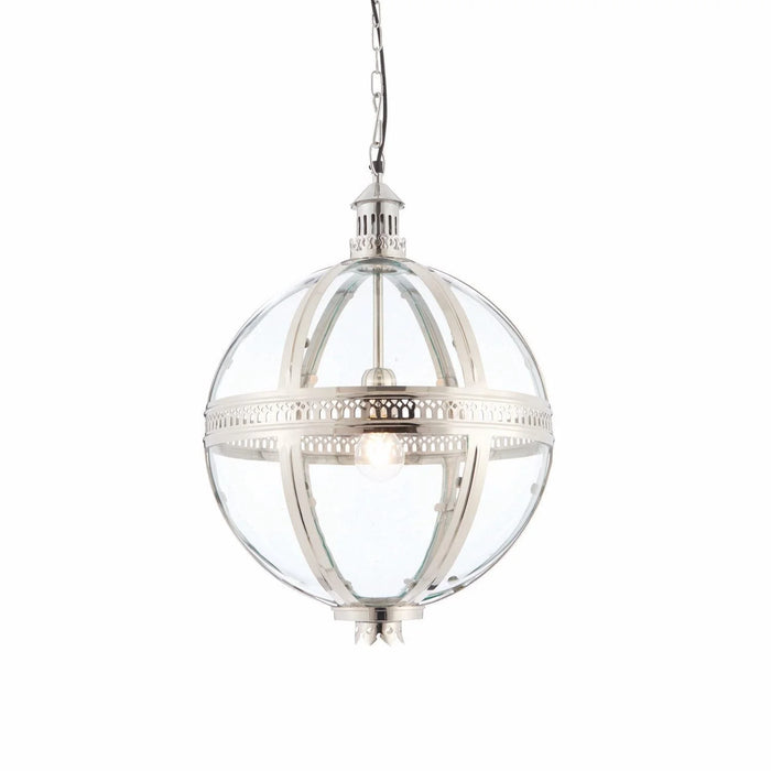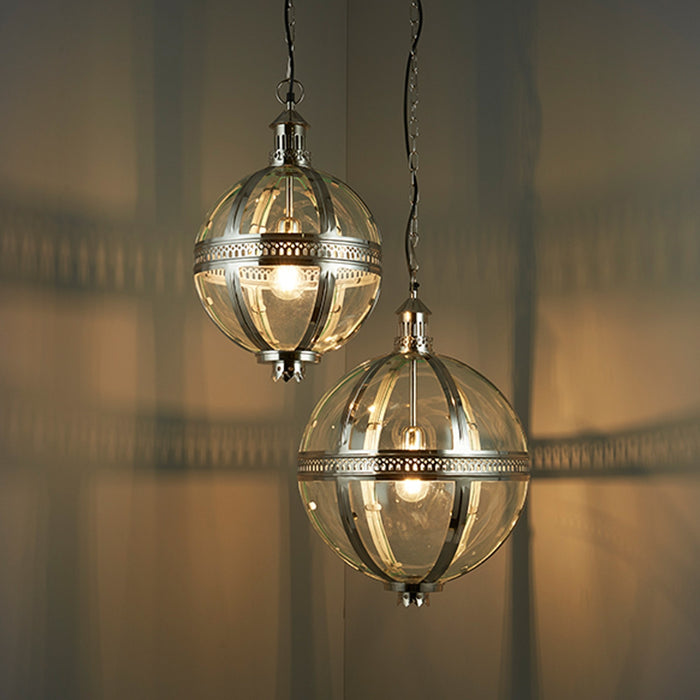 An opulent, eye catching spherical pendant made from nickel plated brass and glass. Compatible with LED lamps and dimmable. More items available in this range. Available in 2 sizes of diameter. Height adjustable and dimmable if using dimmable lamps.