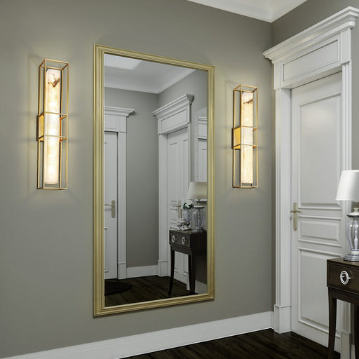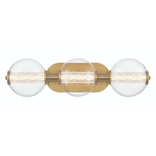 Aged brass finish wall light. The LED integrated light source illuminates the clear artisanal cast glass. Suitable for interior and exterior use. C...