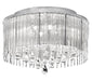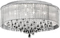 A suite of chrome fittings with crystal droplets, encased in a Lurex fabric and crystal rod shade. With smooth glass droplets hanging beneath it. A glamorous, retro-inspired look.
