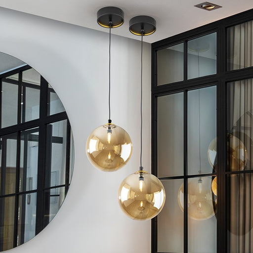 The Eclipse single pendant is finished in matt black, with details of satin brass which is available with an amber coloured spherical glass shade o...
