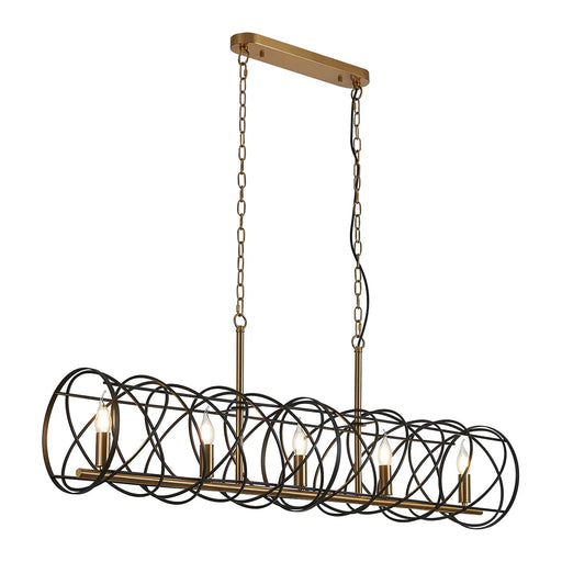 Featuring an intricately structured linear frame which encloses the five E14 lamp holders with over lapping angled rings. This pendant emits a clas...