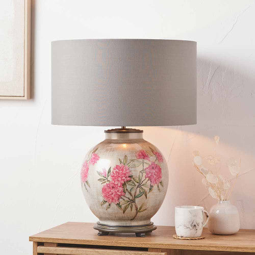 This hand-blown glass lamp is internally decorated with skilfully cut out images of beautiful Dahlia's and Alstroemeria which appear to flow from t...