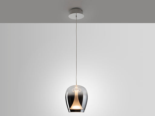 The Miriam Single Pendant is a sleek fitting made with a golden aluminium base and an amber blown glass shade; or a chrome base and smoked glass sh...