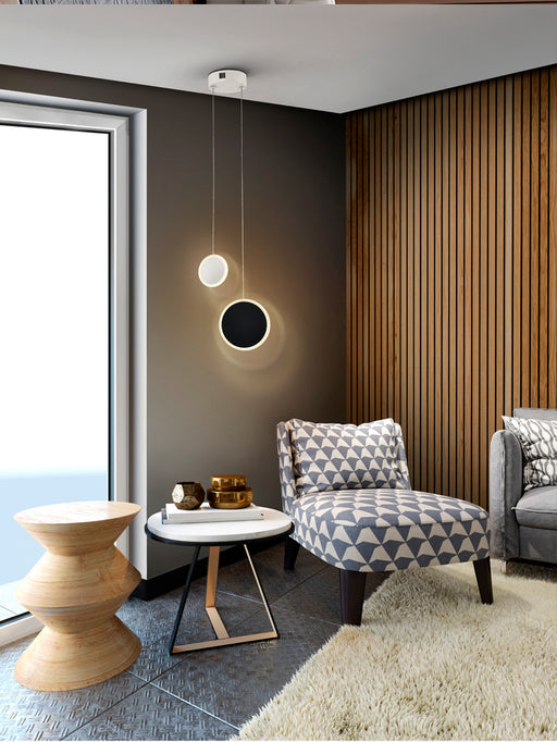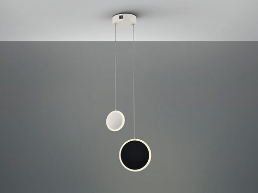The Sally Double Pendant is a stylish modern fitting made of metal, with two hanging discs, finished in matte black and white, with perimeter light...