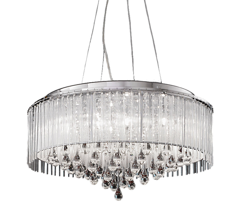 A suite of chrome fittings with crystal droplets, encased in a Lurex fabric and crystal rod shade. With smooth glass droplets hanging beneath it. A glamorous, retro-inspired look.