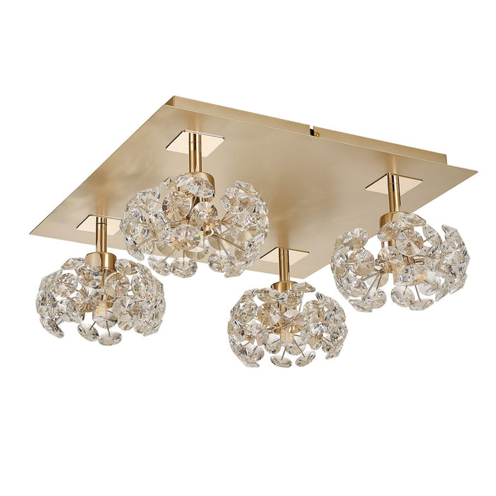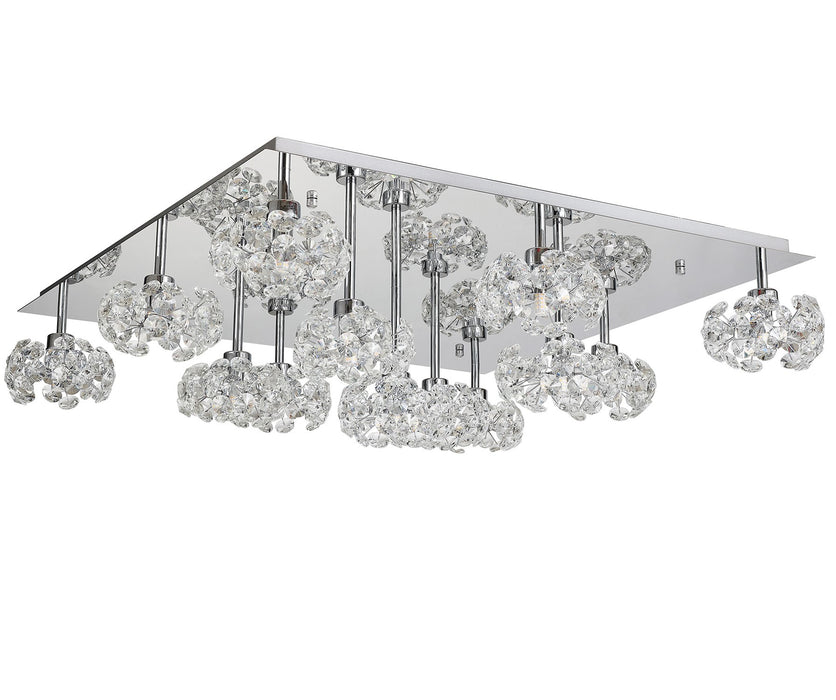 This beautiful square flush fitting is available in either a polished chrome or french gold colour finish and uses slim stems angled erratically to form an enchanting cluster of clear crystal disks around each bulb. Dimmable if using dimmable lamps and ideal for lower ceilings. 4 or 13 light square flush fitting available, lots more items in this family, click link below. The central stems on the 13 light sits slightly lower than the rest.