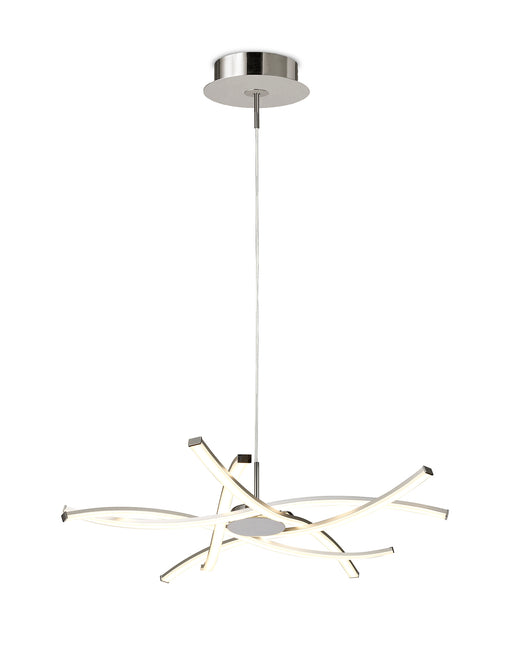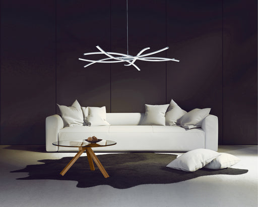 A unique contemporary ceiling pendant with flowing illuminated curves, height adjustable, suspended from thin wire cables creating an amazing desig...