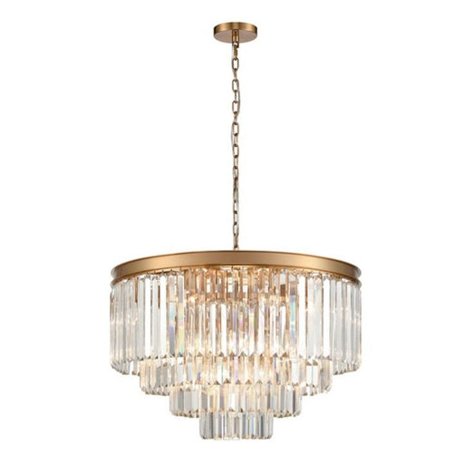 Who said crystal had to team with chrome. The Amelia shakes things up, with its stunning circular brushed brass or black framed pendant with a dou...
