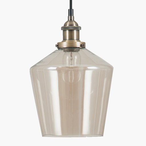 The Bartha is a collection of traditional vintage-inspired pendants. The antique brass metalwork is complemented by a stunning cognac glass shade....