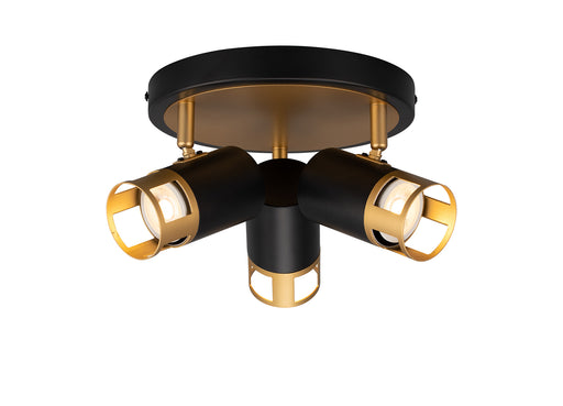 A 3-light ceiling mounted spotlight in matt black with decorative gold cable covers. The interior surface of each shade is finished in gold. This f...