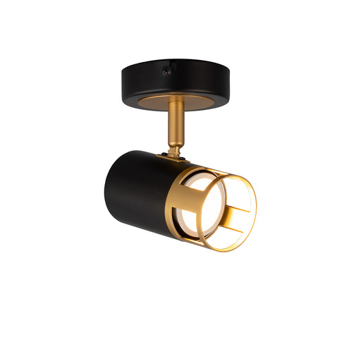 A singe wall spotlight in matt black with decorative gold cable cover. The interior surface of each shade is finished in gold. This fitting has a r...