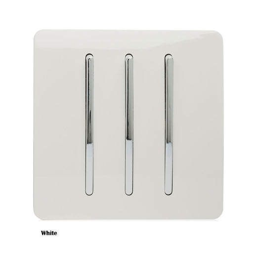 3 gang, 2 way, 10 amp rocker switches available in a vast range of colours to cater for any colour scheme and décor. Elegant, seamless design, retr...
