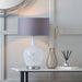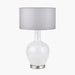 Introducing our Cassie Speckled White Glass Table Lamp. This elegantly curved, glass table lamp base in a clean white hue, incorporates a speckled effect within the glass, adding a subtle, visual texture. The striking glass sits neatly on a brushed silver metal base and is topped off perfectly with a soft grey, faux cotton, lined shade. matching globe lamp and single pendant also available.