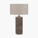 This compact cylindrical wooden base has been hand carved with black diamond shapes to create a unique design. Paired with a tall taupe slubby cotton shade, this lamp makes a charming addition to any living area. Matching smaller lamp aslo available.