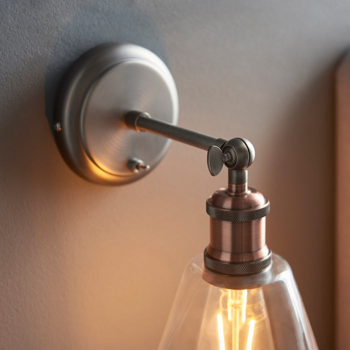 An industrial styled wall light, finished in aged pewter and aged copper, making it an up to date on-trend 'retro' style. Adjustable knuckles and knurled lamp holders complete the authentic look. Perfect when paired with filament LED lamps and easily controlled by a simple on/off switch. Complete the industrial look with the complimentary ceiling and table light options.