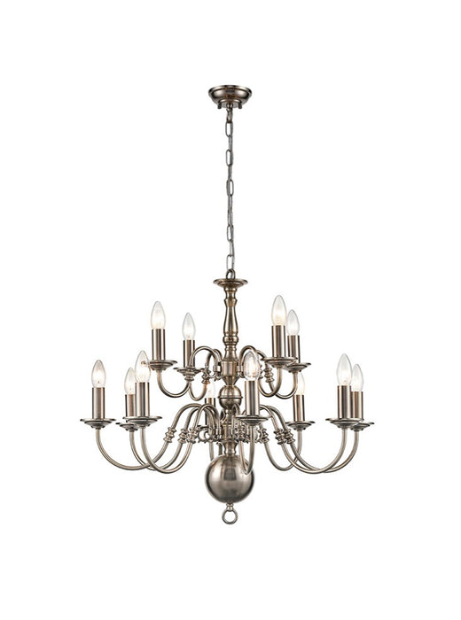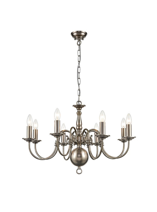 A classical designed light fitting in the traditional Flemish style, finished in pewter. This fitting is available in 3, 5, 8 or 12 light design and also has a matching wall light. The length of the chain can be altered to fit a variety of ceiling heights and this range can be dimmed.