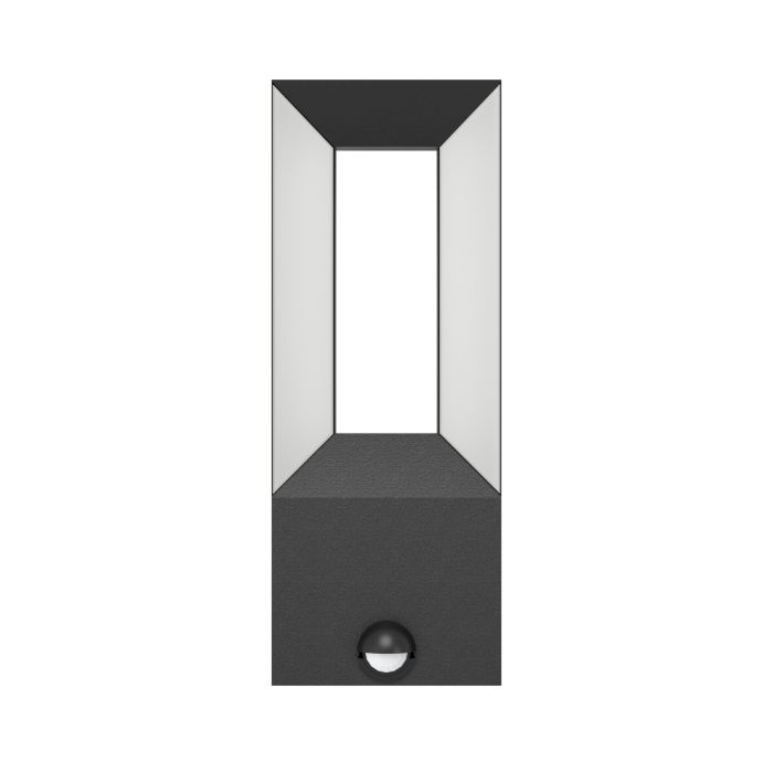 This outdoor wall light from the Edie family is made of black structured powder-coated cast aluminium and white plastic. The two LED boards provide warm white light with 640 lumens each. Includes a motion sensor for motion activated illumination.