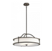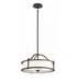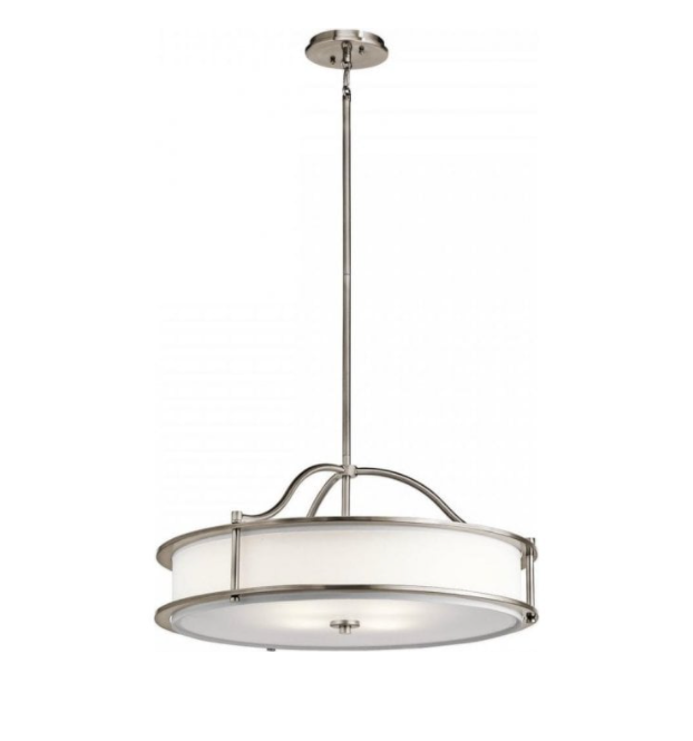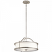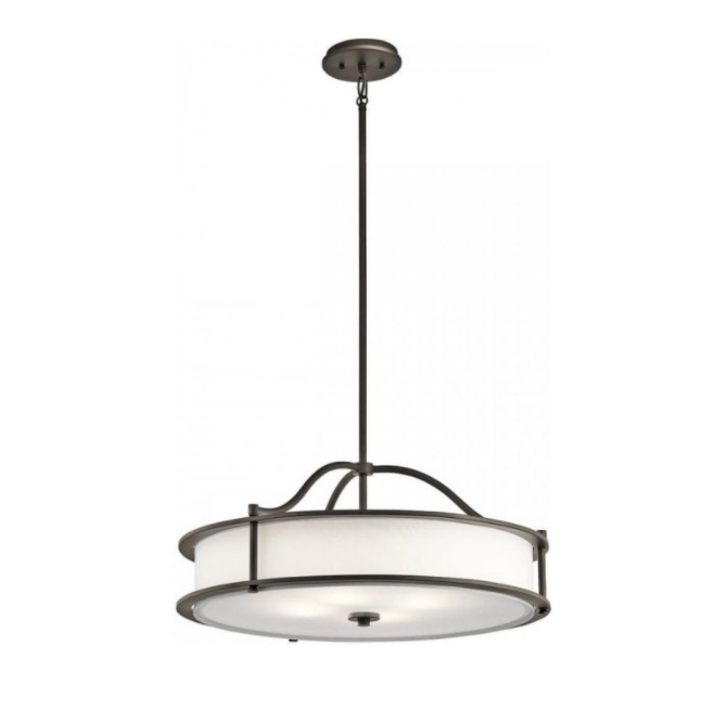 The contemporary Emorett collection has a clean, simplistic design in either an Olde Bronze or Classic Pewter finish with an off-white fabric drum shade and glass diffuser.