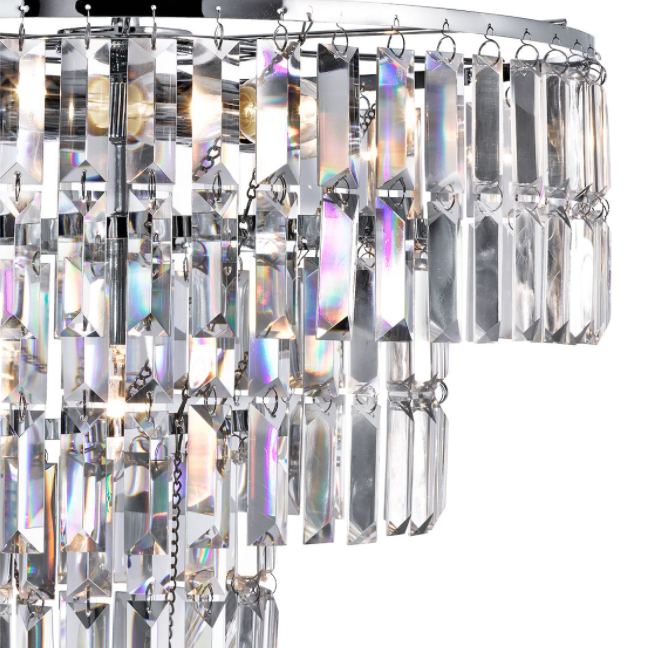 Empree is a spectacular, glittering 5 light tiered pendant with stunning rectangular crystal prisms hanging symmetrically from a modern, chrome finish frame. Create a scintillating, jewellery-like effect with this impactful piece as the main feature in your living area or dining room