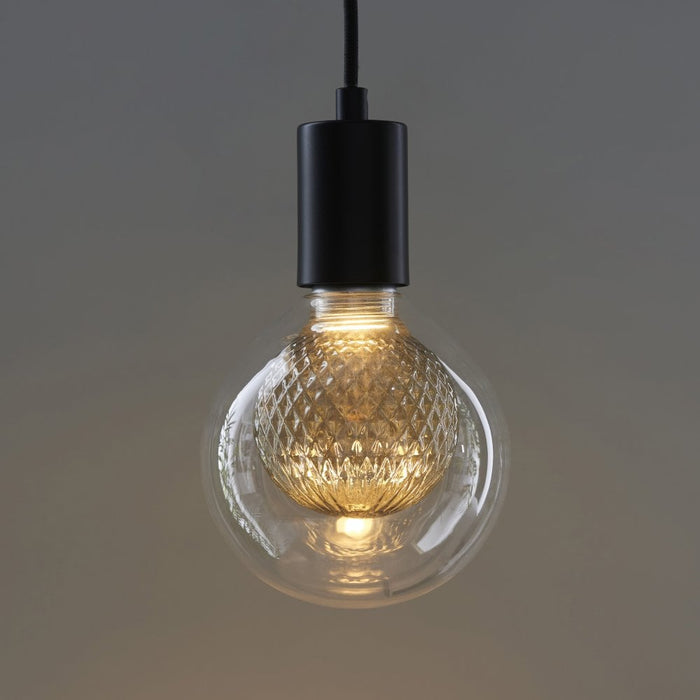Fun contemporary lamp with clear glass outer shade and facetted tinted grey coloured inner glass shade. Anti-glare LED light source that makes for a great gift when paired with a table base; can also be used with flex set.