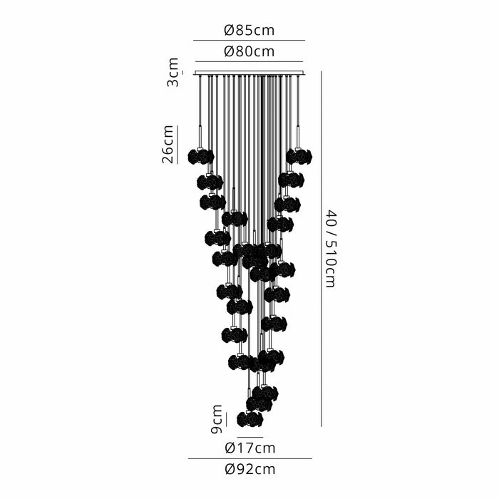 24 Light Diameter 92cm / Height 40cm - 510cm / Weight 25.2kg / 24 x G9 required