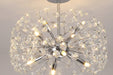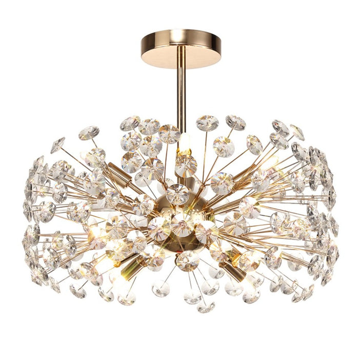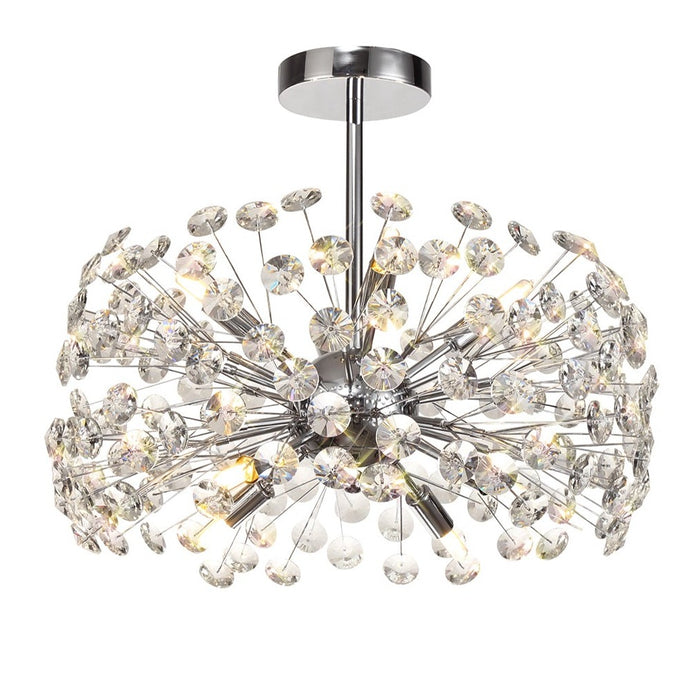 This beautiful semi flush fitting is available in either a polished chrome or french gold colour finish, uses slim stems angled erratically to form an enchanting cluster of clear crystal disks. The central stem acts as a base from which the crystals can sit around the G9 lampholder's ensuring the light emitted from the chosen lamp refracts through each facette throwing sublime spectrums. Dimmable if using dimmable lamps and ideal for lower ceilings.