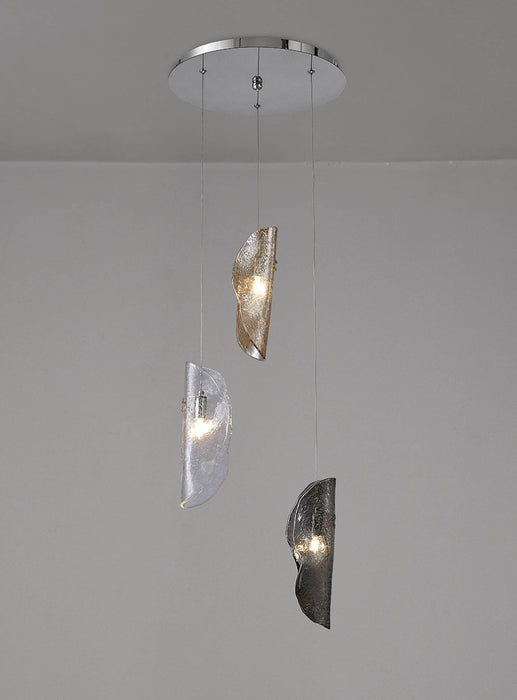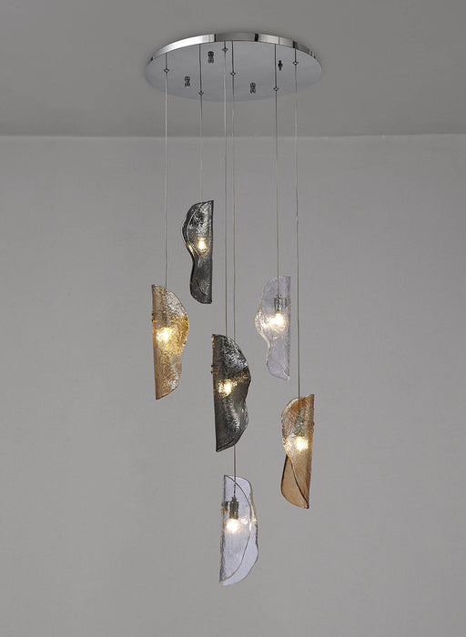 The Hudson consists of wrapped glass pieces which diffuse the light emitted from the G9 lampholders each suspended from an individual drop. With the picturesque collection of clear, amber and smoked glass a serene ambience is provoked by the textured surface of each glass piece which shimmers beneath the coloured tint like light on water.