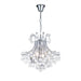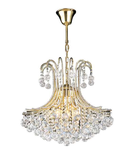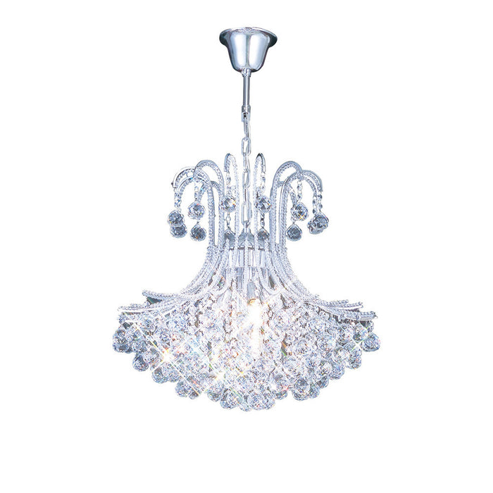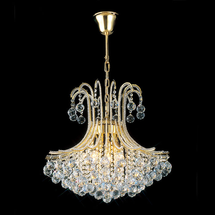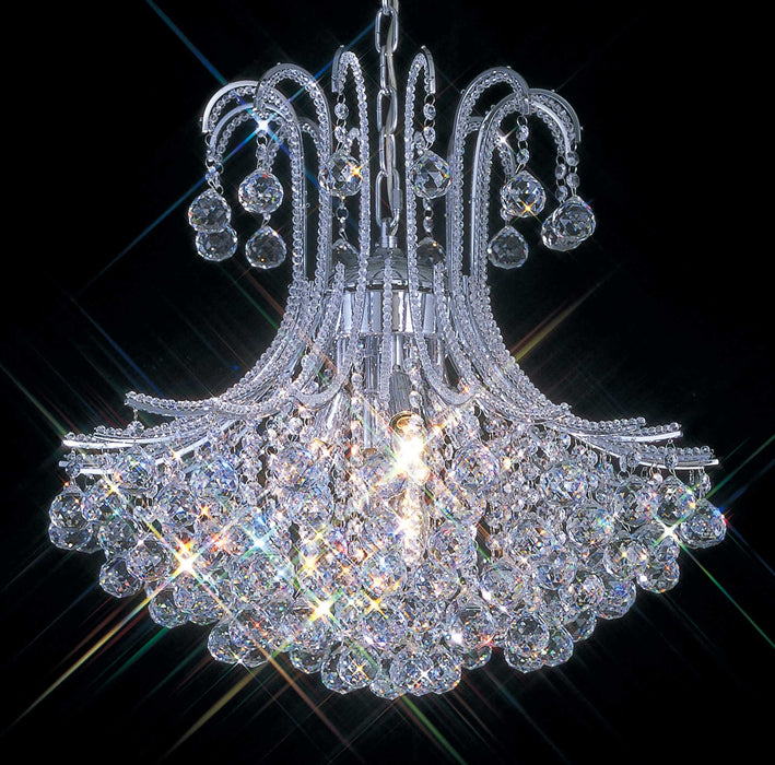 An illustrious Polished Chrome or Gold finish fitting filled with an abundance of tightly arranged large Asfour crystal spheres. The curved framework is trimmed in small crystal beads and finished with strands of octagon crystal and a crystal sphere. The combined radiance of colour from the crystal is extraordinary. Available in 2 sizes, 6 or 6 lights, height adjustable using the chain provided and dimmable.