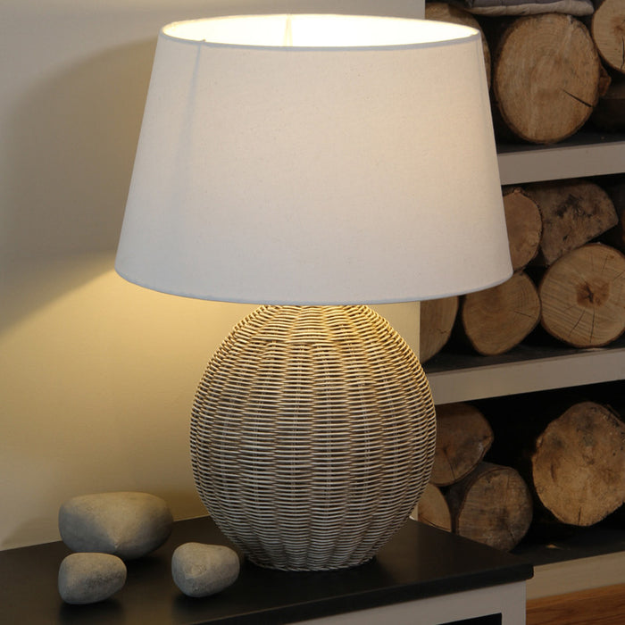 This table lamp base is made from a beautiful antique cream wash Rattan and is in the shape of a ball. Bring the beach hut feel to your home with this fun lamp base and choose one of our shades to match your decor and complete the look. Also available as a smaller lamps which comes complete with shade. (Pictured with our Kalani 16" shade)