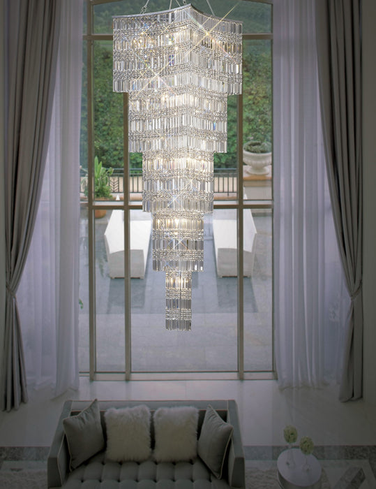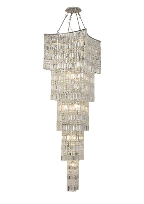 An extravagant range of Polished Chrome fittings that are completely loaded with rectangular and square crystal drops. The curved framework is almost not visible as the crystal is the splendour of this design. The scale of the larger fittings is most impressive whilst the design can still be appreciated in the smaller items. A signature collection that comes with that universal appeal. This XL fitting is available in 2 sizes, 11 & 15 Light fitting. It is height adjustable using suspension chain and dimmable.