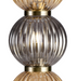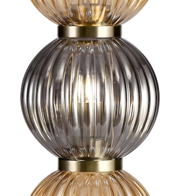 Both the pendant and table lamp featured in the Shelby range host a two tone effect produced by the smoked and amber globe glass. These glass pieces, encircling the G9 lampholders, have a ridged moulding enhancing the luminous sheen given off their coloured tint. The glass fixes to the slim tubular stem, finished in antique brass, in such a way that imitates beads being threaded along string.