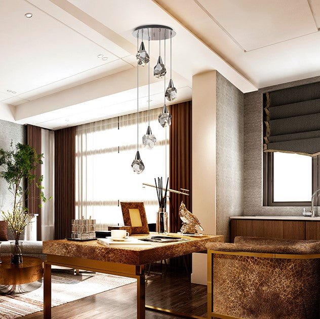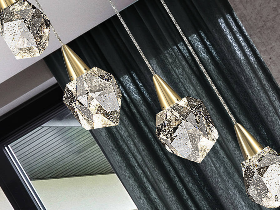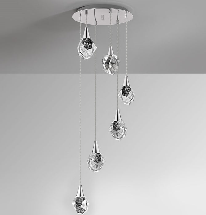 The Starla LED 6 light spiral has a sleek & modern design featuring 6 polyhedron shaped solid glass shades with decorative bubbles inside. This range is available in polished chrome or gold finish and is height adjustable and has 3000k (warm white) integrated LED light. There is also a larger 12 light version and matching products (click link below)