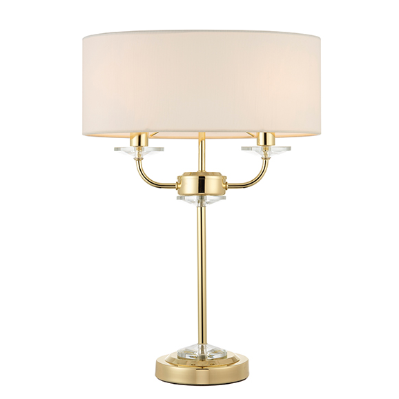The Teresa collection is finished in a bright nickel plate or high-shine gold. The arms are complimented with a touch of crystal and the fitting is topped with a narrow, vintage white, faux silk shade.