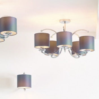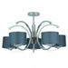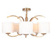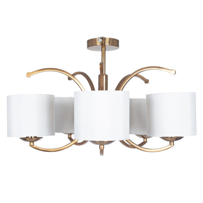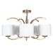 Five cream, faux silk shades sit atop each metal curved arm in this modern chandelier. Minimal, yet bold, this striking piece is an attractive centrepiece in any space. Also available in a three light and it comes in both Satin gold White shades, and Nickel with Grey shades.