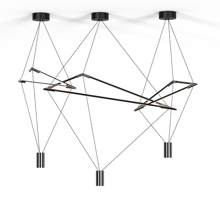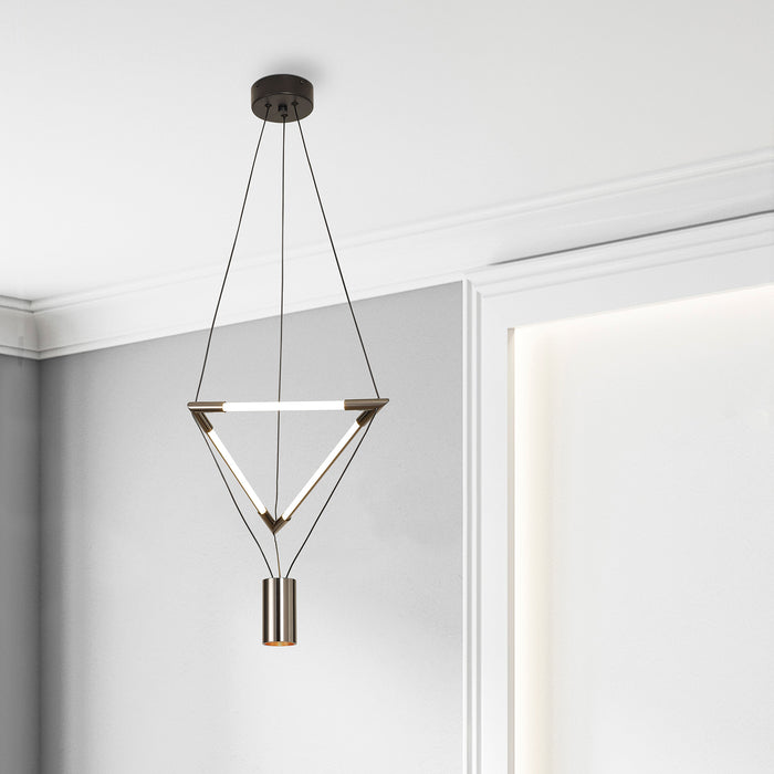 The Volt small pendant is a new and unique fitting to transform your area, available in a large, medium or small version. The design of the fitting is a triangular shape with integrated LED emitting from two areas of the fitting; an acrylic triangular slim tubing in the centre of the fitting and a small cylinder shaped tube located at the bottom of the fitting. The colour finish of the fitting is black/black chrome and white creating an extremely modern feel to the collection. These pendants can be connected together to make a striking feature however you would require electrical points for each pendant used. Height adjustable & non dimmable.
